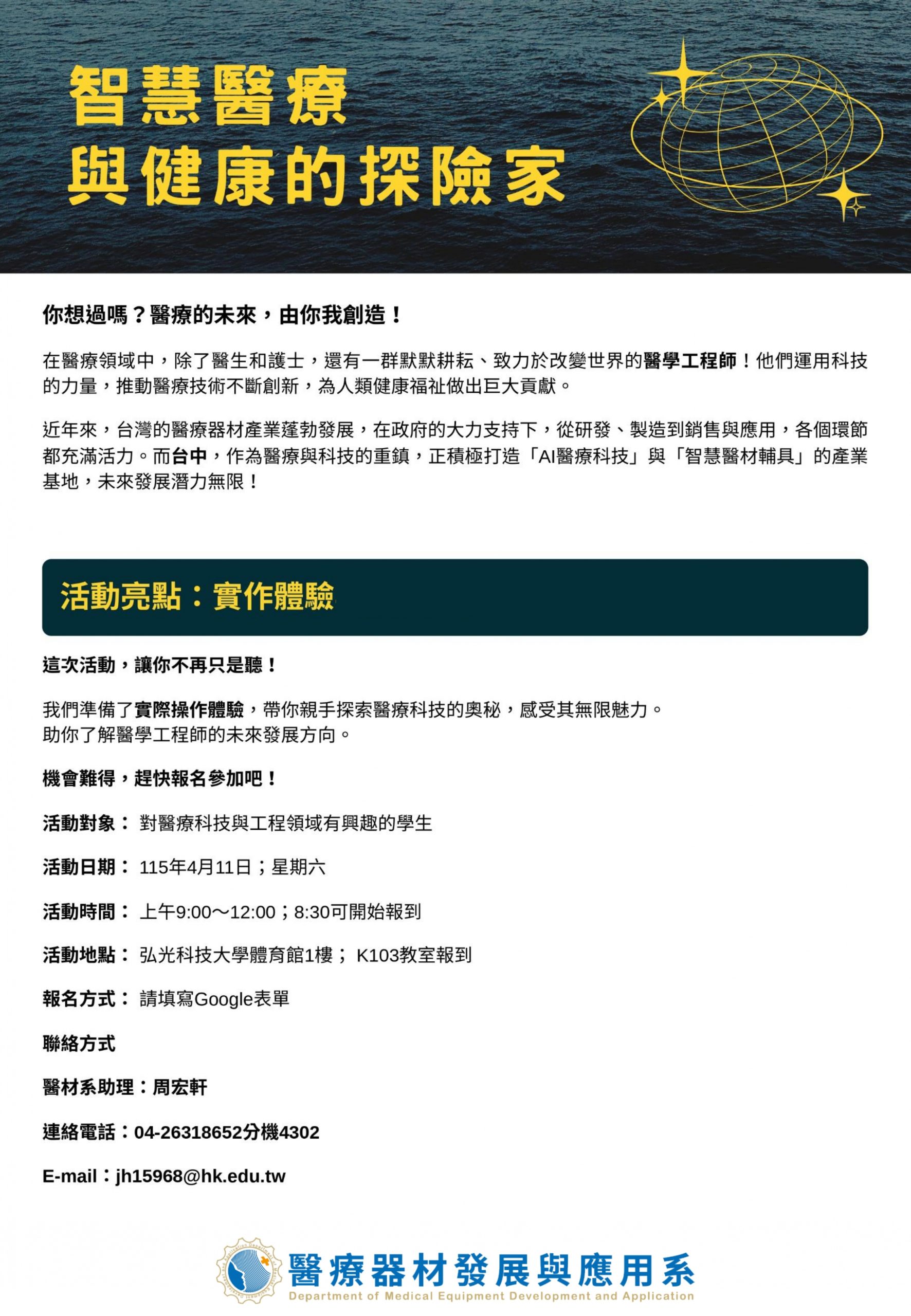 這次活動準備了實際操作體驗,讓你不只是「聽」,更可以「動手做」帶你一次了解醫療科技的魅力,探索未來職涯的無限可能!